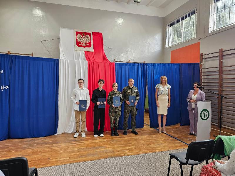 Na ręce Pani Dyrektor złożone zostały również wyróżnienia dla absolwentów naszej szkoły: Dominiki Głowackiej, Gabrieli Prusinowskiej i Wiktora Tomery. Pani Dyrektor Beata Jachurska podkresliła, że sukcesy i zaangażowanie wyróżnionych uczniów stanowią wzór dla całej społeczności szkolnej. Przypominała także, że wytrwałość i pasja prowadzą do pięknych osiągnięć.