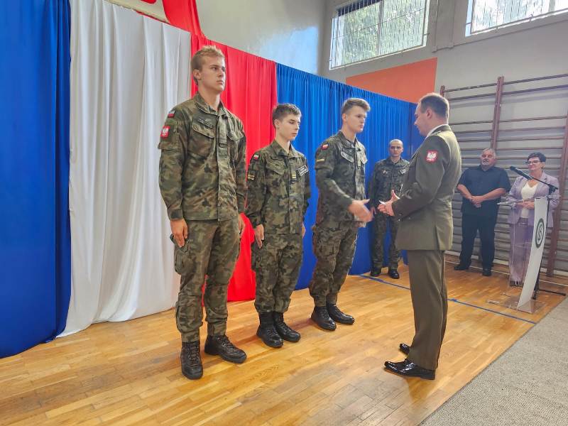 Swoją obecnością uroczystość zaszczycili także: podkomisarz Robert Borowski, który odczytał list Komendanta Wojewódzkiego Policji w Łodzi oraz przedstawiciel WCR w Łodzi – podporucznik Jakub Pilarczyk. W imieniu Ministra Obrony Narodowej przekazał słowa wsparcia i uznania oraz wręczył pamiątkowe przypinki uczniom klas mundurowych – podkreślając znaczenie służby, odpowiedzialności i honoru.