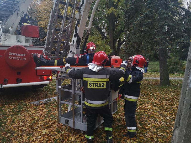 Po dotarciu na wysokość okna mężczyzna znika w głębi pomieszczenia. Najprawdopodobniej stracił przytomność. Strażacy w aparatach powietrznych wchodzą do środka i na desce ratowniczej układają poszkodowanego na podnośniku, który natychmiast zostaje opuszczony na dół. Poszkodowanemu, który uległ zaczadzeniu podany zostaje tlen.