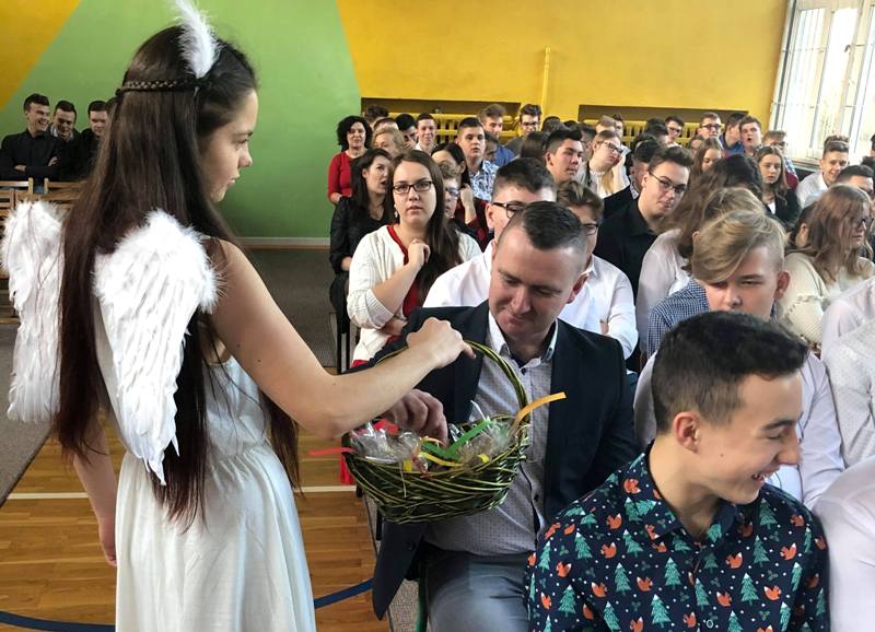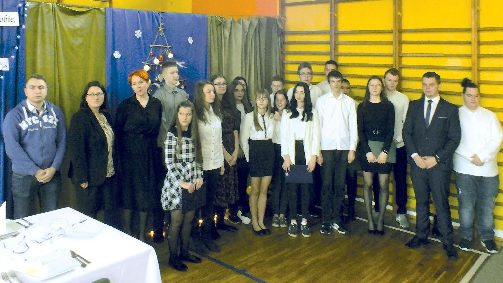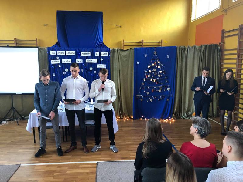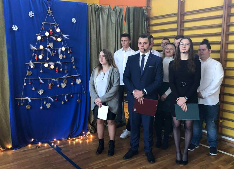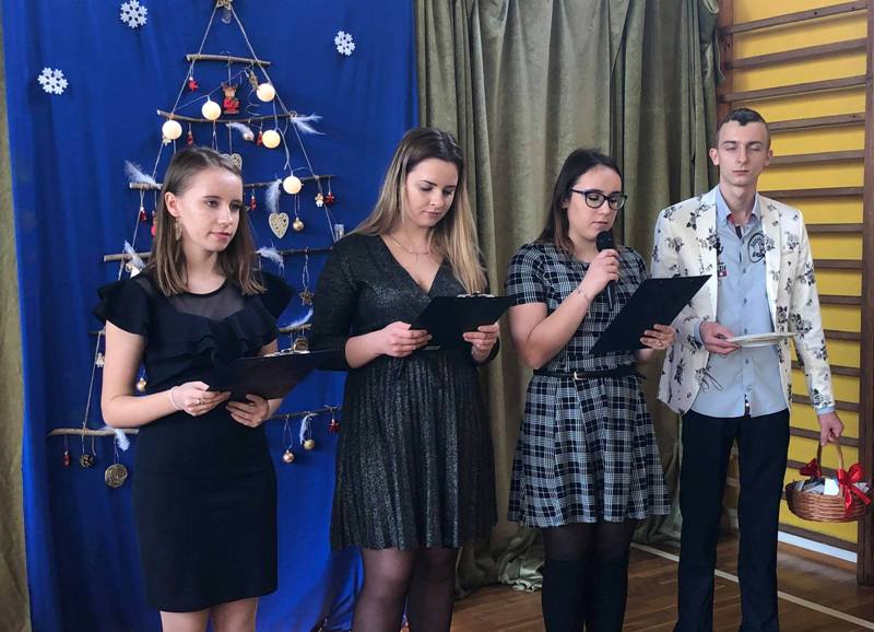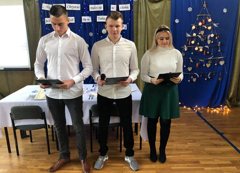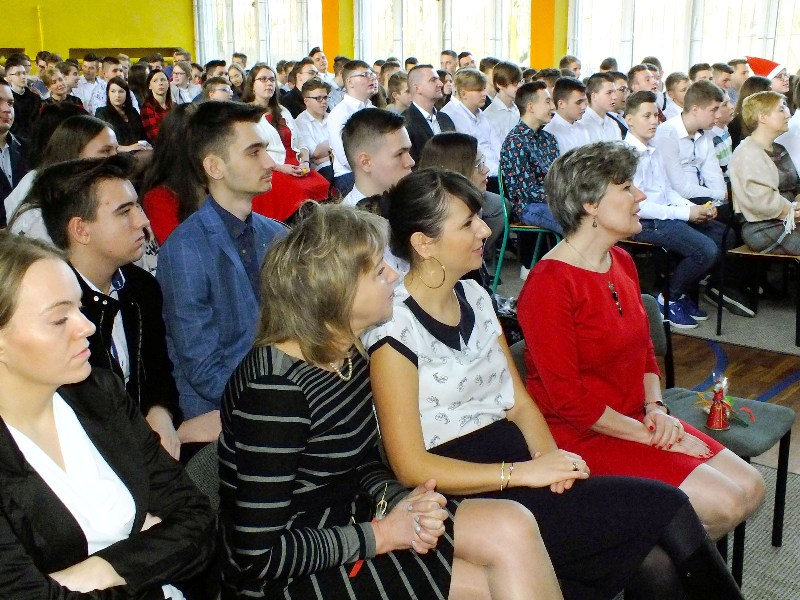 Podczas uroczystości przedstawiciele Samorządu Uczniowskiego przełamali się symbolicznie opłatkiem z p. dyrektor M. Mackiewicz oraz złożyli społeczności szkolnej życzenia świąteczne. Pani dyrektor dziękując wszystkim nauczycielom, pracownikom oraz uczniom za miniony rok pracy i nauki, życzyła wszystkim spokojnych, przeżywanych w rodzinnej atmosferze świąt Bożego Narodzenia. Uwieńczeniem uroczystości były pierniczki wykonane przez klasę I TŻ, rozdawane przez urocze aniołki w nagrodę za piękne i aktywne kolędowanie. Po akademii uczniowie wraz z wychowawcami udali się na klasowe wigilie.