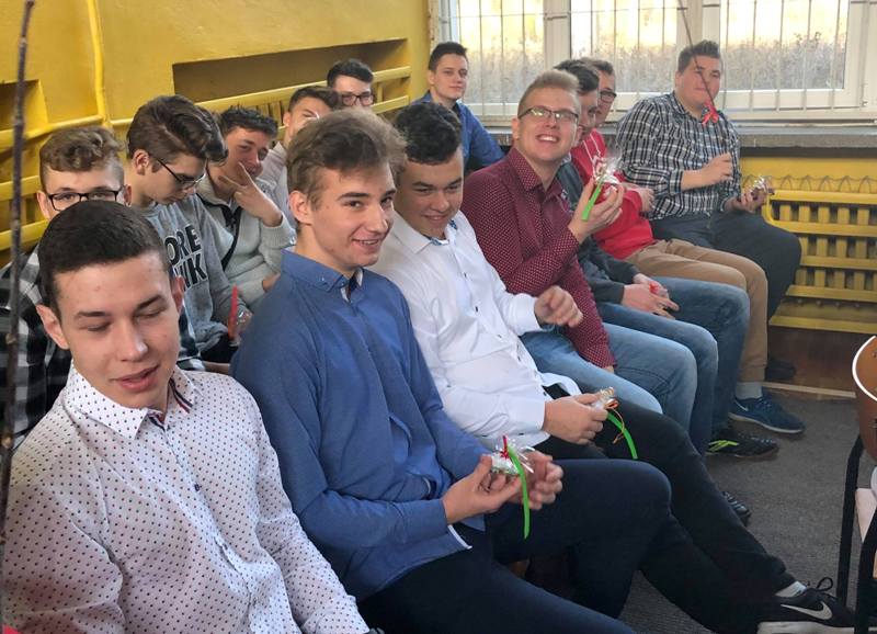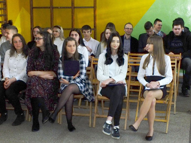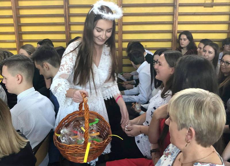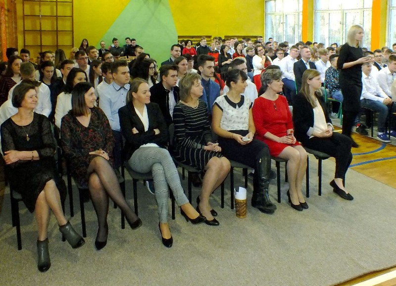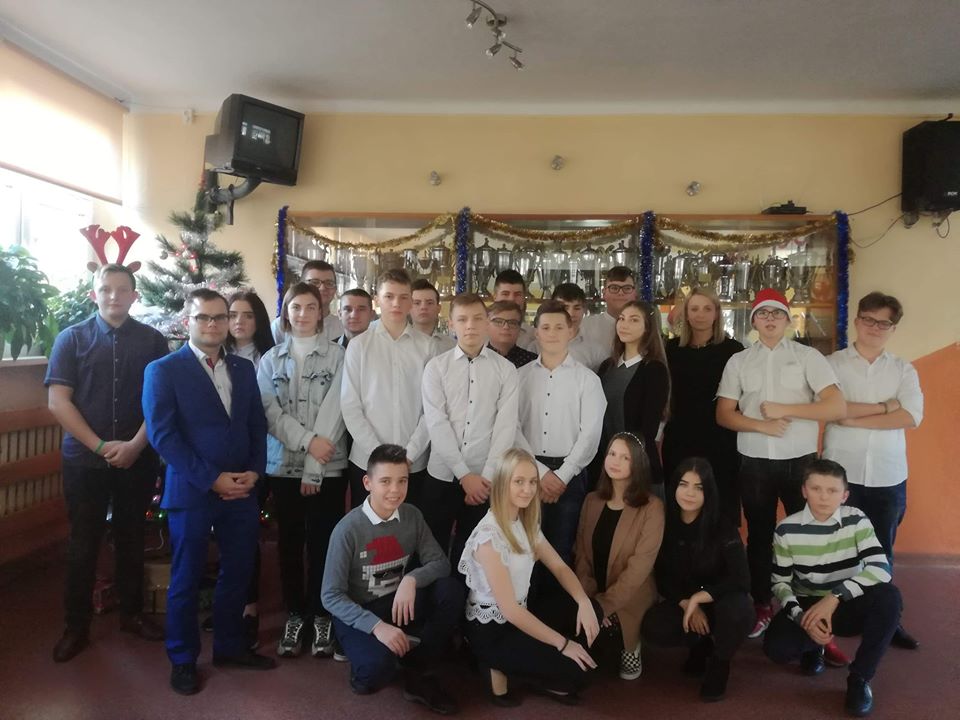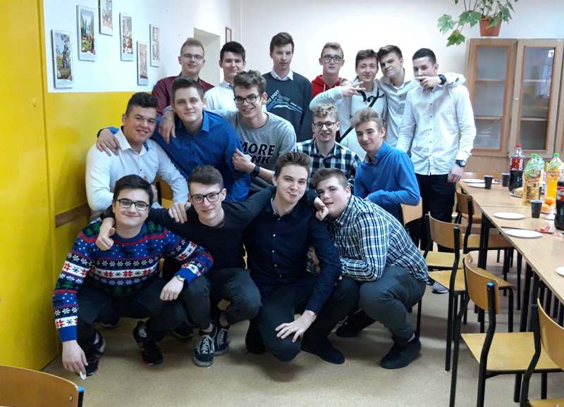Podczas uroczystości przedstawiciele Samorządu Uczniowskiego przełamali się symbolicznie opłatkiem z p. dyrektor M. Mackiewicz oraz złożyli społeczności szkolnej życzenia świąteczne. Pani dyrektor dziękując wszystkim nauczycielom, pracownikom oraz uczniom za miniony rok pracy i nauki, życzyła wszystkim spokojnych, przeżywanych w rodzinnej atmosferze świąt Bożego Narodzenia. Uwieńczeniem uroczystości były pierniczki wykonane przez klasę I TŻ, rozdawane przez urocze aniołki w nagrodę za piękne i aktywne kolędowanie. Po akademii uczniowie wraz z wychowawcami udali się na klasowe wigilie.