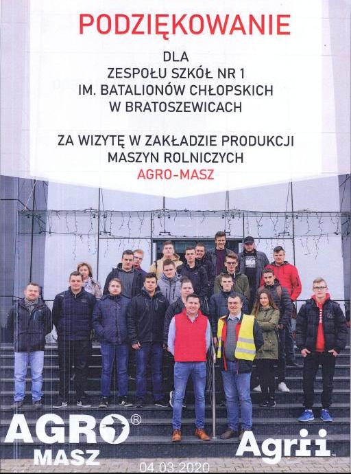 W dniu 4 marca uczniowie klas 4TR, 4TM oraz 2TA uczestniczyli w wycieczce zawodowej do fabryki maszyn Agro – Masz w Strzelcach Małych. Wycieczka rozpoczęła się od przedstawienia krótkiej historii firmy. Krótkiej bowiem firma ta powstała w 2006 roku, jednak po zaledwie 14 latach działania na rynku praktycznie w niczym nie przypomina tej firmy sprzed lat. Dziś jest to jedna z największych firm działających w branży rolniczej w Polsce, która wysyła swoje produkty na rynki całego świata.