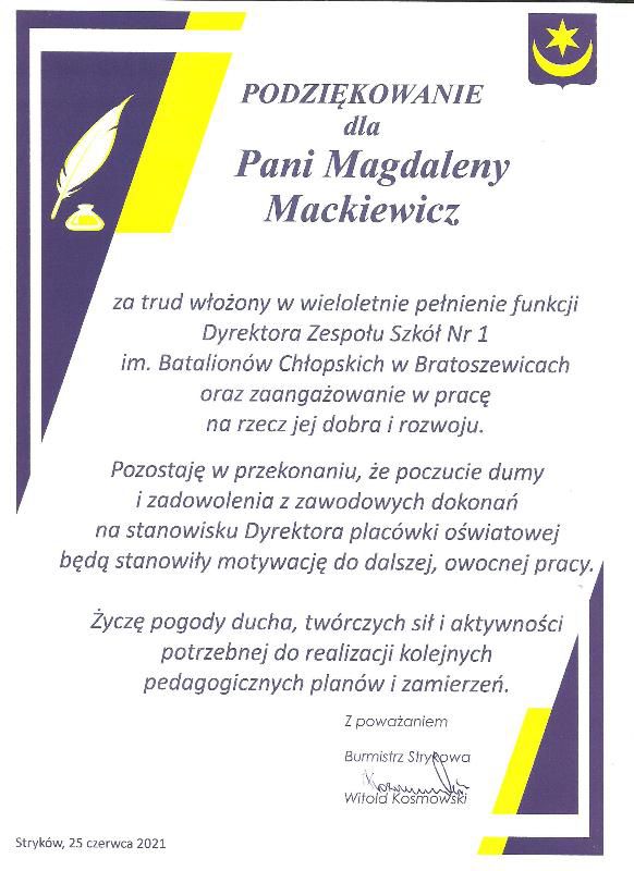 Pani dyrektor Magdalena Mackiewicz podziękowała wszystkim za słowa uznania i życzenia” „Miałam ogromne szczęście, że przez wszystkie lata mojej misji współpracowałam z ludźmi, na których zaangażowanie zawsze mogłam liczyć….. Dziękuję Burmistrzowi Strykowa za wsparcie Szkoły w jej rozwoju….Dziękuję w sposób szczególny Pani Elżbiecie Czesny oraz Pani Beacie Jachurskiej, z którymi przez ostatnie lata kierowałam Szkołą….. Dziękuję nie tylko Pracownikom, Młodzieży i Rodzicom, Absolwentom, ale i Przyjaciołom Zespołu, jestem wdzięczna, za wspólnie napisane chlubne karty historii Zespołu Szkół Nr 1 im. Batalionów Chłopskich w Bratoszewicach…”