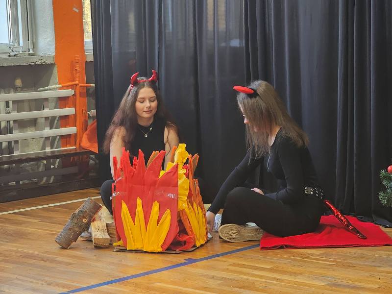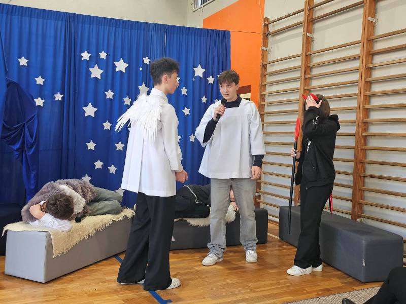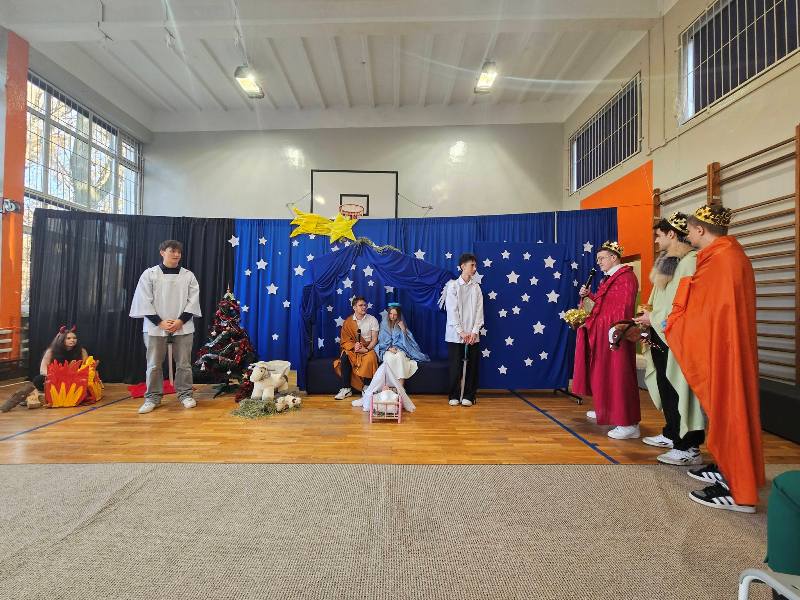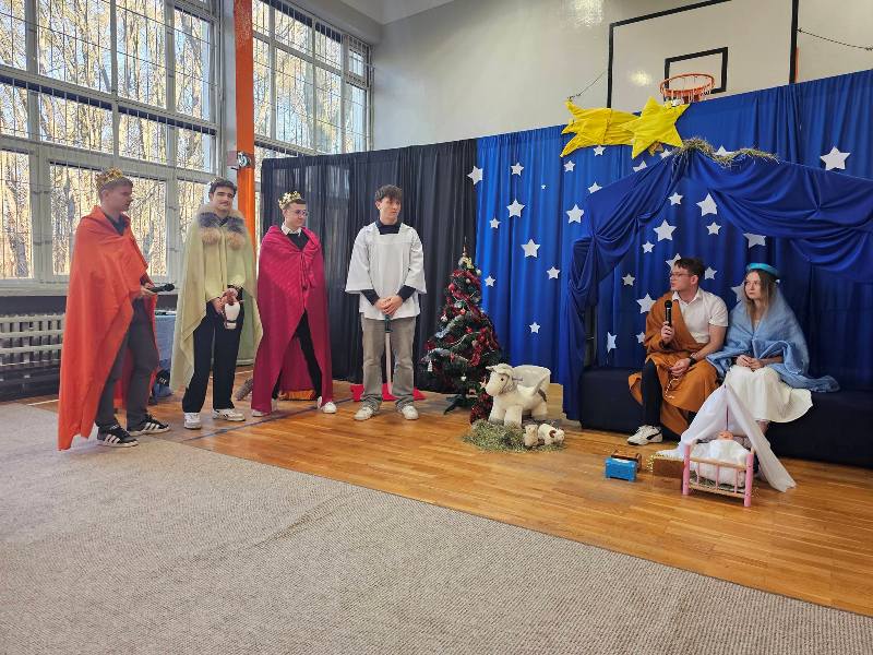 W piątek, 19 grudnia 2025 roku społeczność naszej szkoły przeżywała wyjątkowe chwile podczas uroczystych jasełek bożonarodzeniowych. Wydarzenie zostało rozpoczęte słowami: „Nadeszły święta, Bóg na świat przyszedł, zbawienia łaski dał nam obficie…”, które wprowadziły zgromadzonych w nastrój skupienia, refleksji oraz radosnego oczekiwania na Święta Bożego Narodzenia. Nad przebiegiem uroczystości czuwali uczniowie klas 3 LOb oraz 4 TL wraz z wychowawcami. Z wielkim zaangażowaniem i artystyczną wrażliwością zaprezentowali historię narodzin Jezusa, łącząc tradycyjny przekaz z subtelnym humorem. Na scenie pojawili się m.in. archaniołowie Michał i Gabriel, diabły, Trzej Królowie, Herod, pasterze oraz Święta Rodzina. Przedstawienie niosło ze sobą uniwersalne przesłanie miłości i nadziei. Starannie przygotowana oprawa, znakomita gra aktorska oraz ciepły, świąteczny nastrój sprawiły, że jasełka stały się prawdziwym duchowym przeżyciem i pięknym darem, zgodnie z polską tradycją: „My zaś, jak polski obyczaj każe, jasełka chcemy nieść Jemu w darze”.