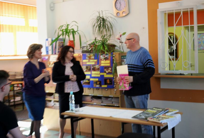 Interesujące spotkanie z pisarzem panem Jackiem Perzyńskim zakończyło podziękowanie i wręczenie przez dyrektor panią Magdalenę Mackiewicz dyplomu i symbolicznego upominku. Następnie autor dokonał wpisu do szkolnej księgi pamiątkowej, a także podpisał nam egzemplarze swoich książek.