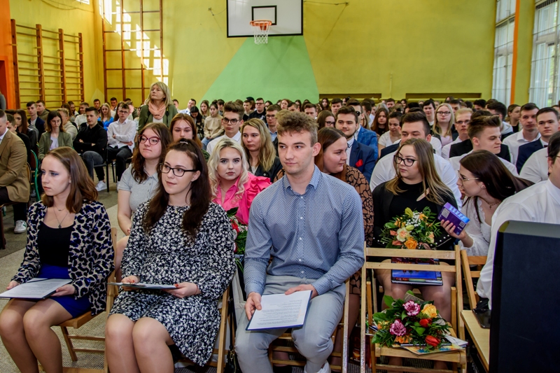 Rangę akademii podkreślała obecność sztandaru szkolnego i zachowanie ceremoniału. Po odśpiewaniu hymnu narodowego otwarcia uroczystości dokonała Pani Dyrektor Beata Jachurska, która serdecznie przywitała wszystkich zebranych z uwzględnieniem zaproszonych gości: Burmistrza Strykowa- Pana Witolda Kosmowskiego oraz Zastępcę Burmistrza Strykowa- Panią Tamarę Barańską- Kiemaczyńską. W swoim przemówieniu Pani Dyrektor podziękowała maturzystom za wieloletnią pracę na rzecz szkoły a także podkreśliła fakt, jak wiele działań musiał podjąć każdy z nich, aby dojść do celu, jakim niewątpliwie jest otrzymanie świadectwa ukończenia szkoły. Życząc absolwentom sukcesów zarówno w życiu osobistym, jak i zawodowym Pani Dyrektor razem z Panem Burmistrzem wręczyli maturzystom nagrody wraz z pamiątkowymi dyplomami za wyniki w nauce oraz za zaangażowanie i pracę na rzecz szkoły. Korzystając z tej wyjątkowej okazji, zostały również przyznane Stypendia Prezesa Rady Ministrów uczniom, którzy uzyskali najwyższą średnią ocen w szkole; uhonorowanymi zostali zatem najzdolniejsi: Adam Trojan (uczeń klasy IV Technikum Logistycznego), Alicja Piątkowska (uczennica klasy III Technikum Żywienia i Usług Gastronomicznych) oraz Wiktoria Urbańska (uczennica klasy II Liceum Ogólnokształcącego).
