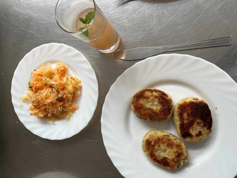 Kolejny zdrowy posiłek, przygotowany przez naszych uczniów, stanowiły kotlety z ziemniaków i pieczarek (jak widać można przygotować bezmięsne kotlety). Ziemniaki to doskonałe źródło energii, białka, witamin i składników mineralnych; znajdziemy w nich przede wszystkim znaczne ilości potasu (100 g porcji zawiera aż 443 mg tego pierwiastka), fosfor, magnez, cynk, miedź, mangan i jod. Ziemniaki są także cennym źródłem witaminy C, witamin z grupy B, beta karotenu oraz folianów. Ku ogólnemu zaskoczeniu ziemniaki zawierają niewiele kalorii – w porcji 100 g są zaledwie 73 kcal, czyli znacznie mniej niż w takiej samej porcji kaszy czy makaronu. Są one doskonałym źródłem błonnika pokarmowego, który poprawia perystaltykę jelit, ułatwia trawienie, a także pomaga w walce z nadwagą i otyłością poprzez zwiększanie objętość treści pokarmowej, a co za tym idzie daje uczucie sytości.