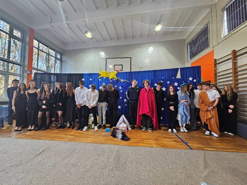 W piątek, 19 grudnia 2025 roku społeczność naszej szkoły przeżywała wyjątkowe chwile podczas uroczystych jasełek bożonarodzeniowych. Wydarzenie zostało rozpoczęte słowami: „Nadeszły święta, Bóg na świat przyszedł, zbawienia łaski dał nam obficie…”, które wprowadziły zgromadzonych w nastrój skupienia, refleksji oraz radosnego oczekiwania na Święta Bożego Narodzenia. Nad przebiegiem uroczystości czuwali uczniowie klas 3 LOb oraz 4 TL wraz z wychowawcami. Z wielkim zaangażowaniem i artystyczną wrażliwością zaprezentowali historię narodzin Jezusa, łącząc tradycyjny przekaz z subtelnym humorem. Na scenie pojawili się m.in. archaniołowie Michał i Gabriel, diabły, Trzej Królowie, Herod, pasterze oraz Święta Rodzina. Przedstawienie niosło ze sobą uniwersalne przesłanie miłości i nadziei. Starannie przygotowana oprawa, znakomita gra aktorska oraz ciepły, świąteczny nastrój sprawiły, że jasełka stały się prawdziwym duchowym przeżyciem i pięknym darem, zgodnie z polską tradycją: „My zaś, jak polski obyczaj każe, jasełka chcemy nieść Jemu w darze”.