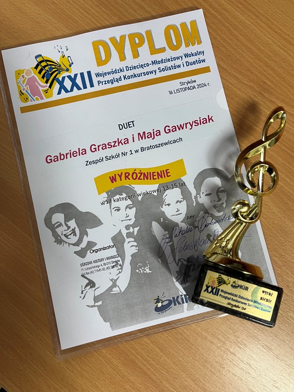 16 listopada br. nasze uczennice z klasy I LO- Gabriela Graszka i Maja Gawrysiak- wzięły udział w XXII Wojewódzkim Przeglądzie Wokalnym Solistów i Duetów, który odbył się w Strykowie. Dziewczęta zdobyły wyróżnienie i tym samym odniosły wielki sukces muzyczny. Opiekunem duetu była p. Katarzyna Biernacka.