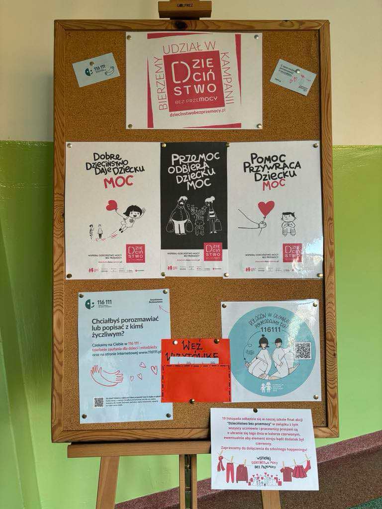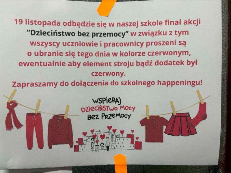 W dniach poprzedzających 19 listopada, w szkole odbywała się akcja promująca kampanię "Dzieciństwo bez przemocy", mająca na celu zwrócenie uwagi na problem przemocy wobec dzieci oraz promowanie bezpiecznego i wspierającego środowiska dla najmłodszych. W ramach wydarzenia zorganizowano różnorodne działania edukacyjne. Kulminacyjnym punktem akcji był happening, który miał miejsce 19 listopada. W tym dniu cała społeczność szkolna – uczniowie, nauczyciele oraz pracownicy szkoły – ubrali się na czerwono, symbolizując solidarność z dziećmi dotkniętymi przemocą. Dodatkowo, budynek szkoły został podświetlony na czerwono, co miało na celu zwrócenie uwagi lokalnej społeczności na problem przemocy wobec dzieci. Akcja cieszyła się dużym zainteresowaniem i była wyrazem zaangażowania szkoły w promowanie wartości związanych z szacunkiem, bezpieczeństwem i ochroną praw dzieci.
