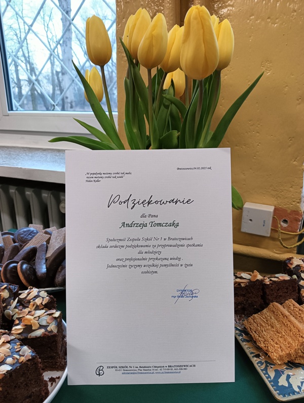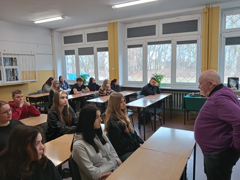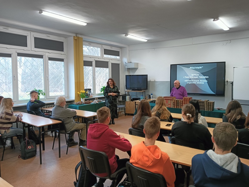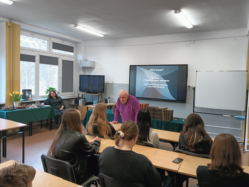 W ramach propagowania działań promujących zainteresowanie książką i czytelnictwem wśród młodzieży, 4 lutego 2025 roku w naszej bibliotece odbyło się spotkanie z Panem Andrzejem Tomczakiem - miłośnikiem książek, literatury oraz przyjacielem młodzieży. Słuchaczami byli uczniowie klasy IV Technikum Logistycznego.