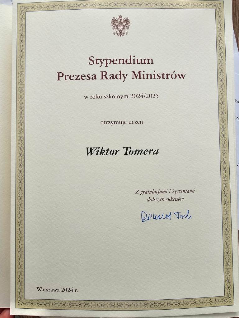 Wiktor Tomera w gronie stypendystów Prezesa Rady Ministrów i Ministra Edukacji Narodowej