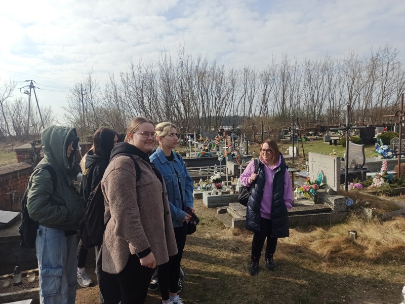 Kolejnym elementem dnia był spacer po terenie zespołu pałacowego, podczas którego pani Król-Kamińska dzieliła się ciekawostkami i odpowiadała na pytania uczniów. Następnie odwiedziliśmy kościół parafialny, gdzie ksiądz proboszcz Mateusz Cieplucha przedstawił uczestnikom historię świątyni, silnie związaną z rodziną Rzewuskich – dawnych właścicieli Bratoszewic. Po zwiedzeniu kościoła udaliśmy się na miejscowy cmentarz, gdzie uczniowie uporządkowali groby, zapalili znicze i uczcili pamięć rodziny Rzewuskich oraz Nieznanego Żołnierza poległego podczas Kampanii Wrześniowej.