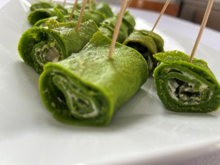Naleśniki smarować serkiem i farszem szpinakowym, zwijać