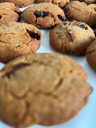 Do wyrobionego ciasta dodać bakalie, raz jeszcze zagnieść, by całość się połączyła. Przygotować dwie płaskie blaszki do ciasteczek. Wysmarować je masłem i wyłożyć papierem do pieczenia (można z tego zrezygnować, jeśli blaszka jest z nieprzywierającego materiału). Z ciasta formować kulki wielkości niedużego orzecha włoskiego. Układać na blaszce, w sporych odstępach od siebie, delikatnie spłaszczając je dłonią.