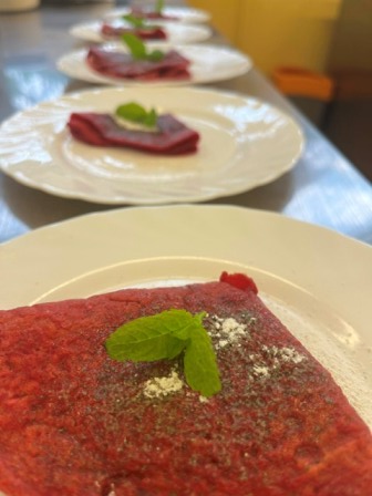 Farsz nakładać na naleśniki buraczane i formować, posypać cukrem pudrem zmieszanym z rozdrobnioną mietą