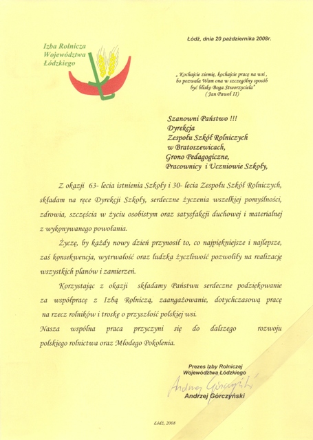 20 października 2008 r. to data szczególna. W tym dniu obchodziliśmy 63-lecie istnienia naszej szkoły i 30-lecie istnienia Zespołu Szkół Rolniczych w Bratoszewicach. Ten, jakże uroczysty w życiu szkolnej społeczności dzień rozpoczął się Mszą świętą w kościele parafialnym. Po nabożeństwie uczniowie wraz z nauczycielami i zaproszonymi gośćmi skierowali kroki w stronę odświętnie przybranego budynku szkoły, gdzie kontynuowaliśmy obchody jubileuszu.